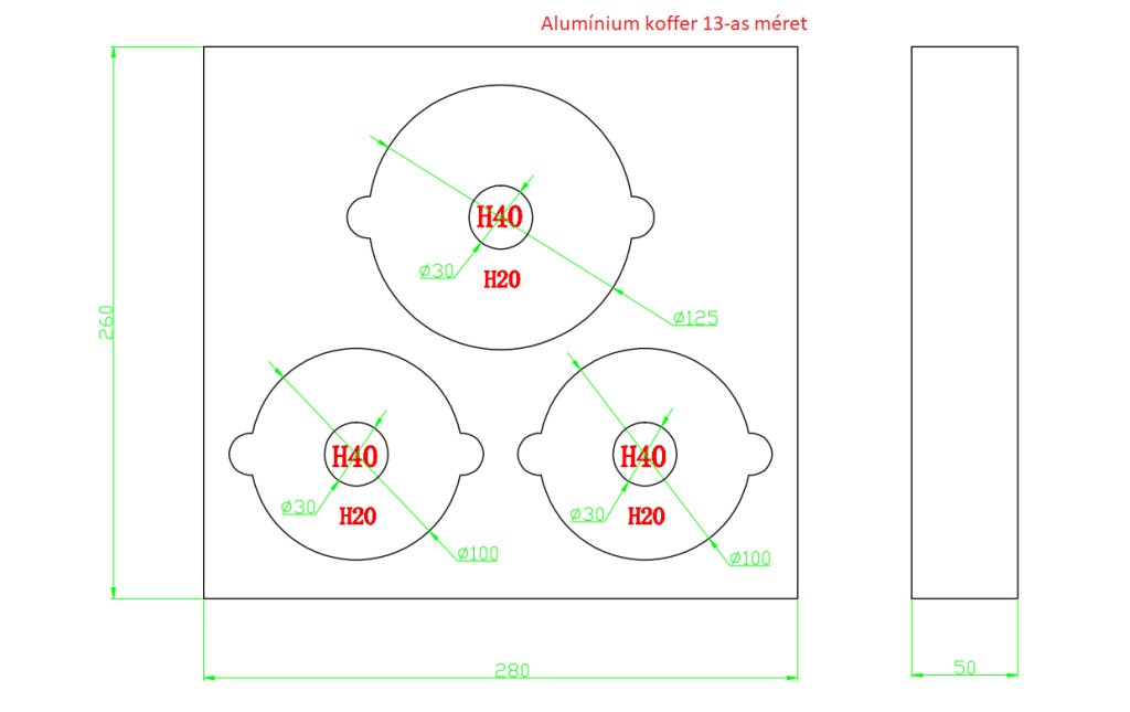 13-as koffer tárolásra alkalmas méretek: 1: Ø 100mm vagy Ø 30mm, 2: Ø 100mm vagy Ø 30mm, 3 Ø 125mm vagy Ø 30mm.